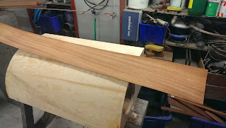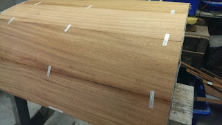 Använder sen skåpet som form för att limma lite lister till skåpsdörren, fem remsor med mahognyfanér läggs mellan lite plast och tvingas fast på skåpet.