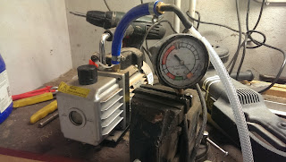 Vaccumpumpen får jobba på under natten så epoxyn hinner bita fast.