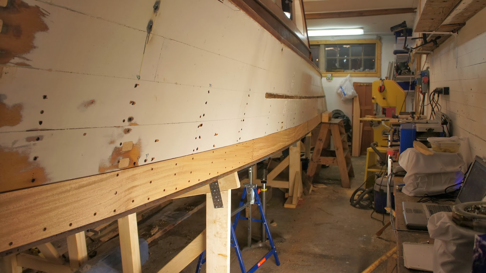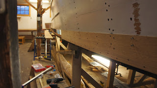 Första biten på plats på styrbords sida. Skruvar med rostfri träskruv i slagvägaren, och med RF M4 i träspanten och RF M5 i stålspanten.