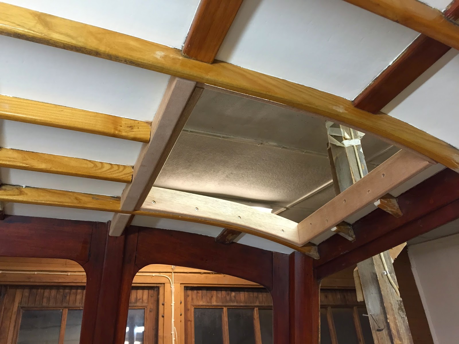 Takluckan över trappen ut på fördäck var en hemsk historia, en plåtlucka tung som om den vore gjord av bly. Därför gör vi en ny i trä. Den är böjd på alla sätt o vis, så den limmas ihop av flera lager mahognyremsor över en form.