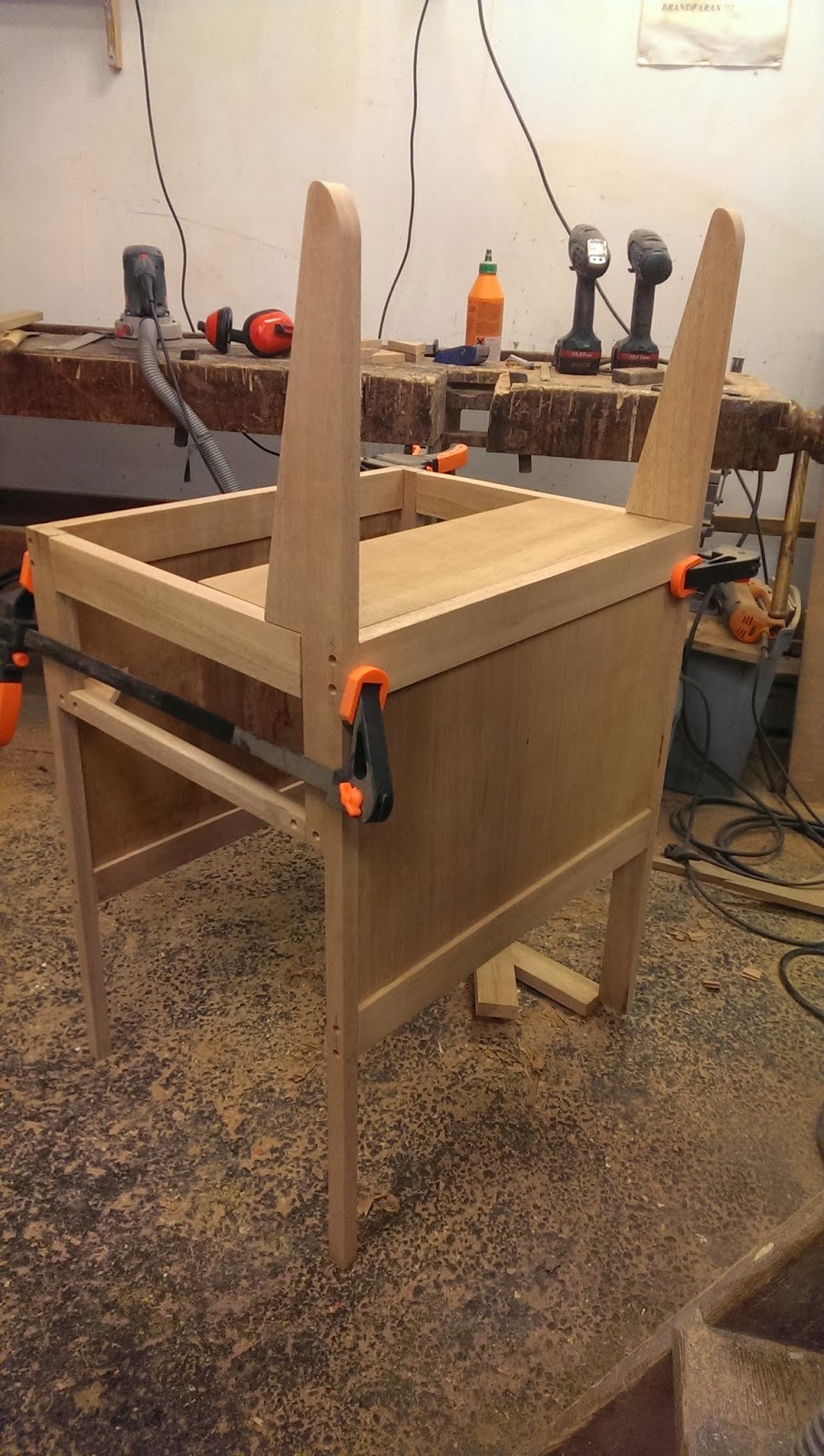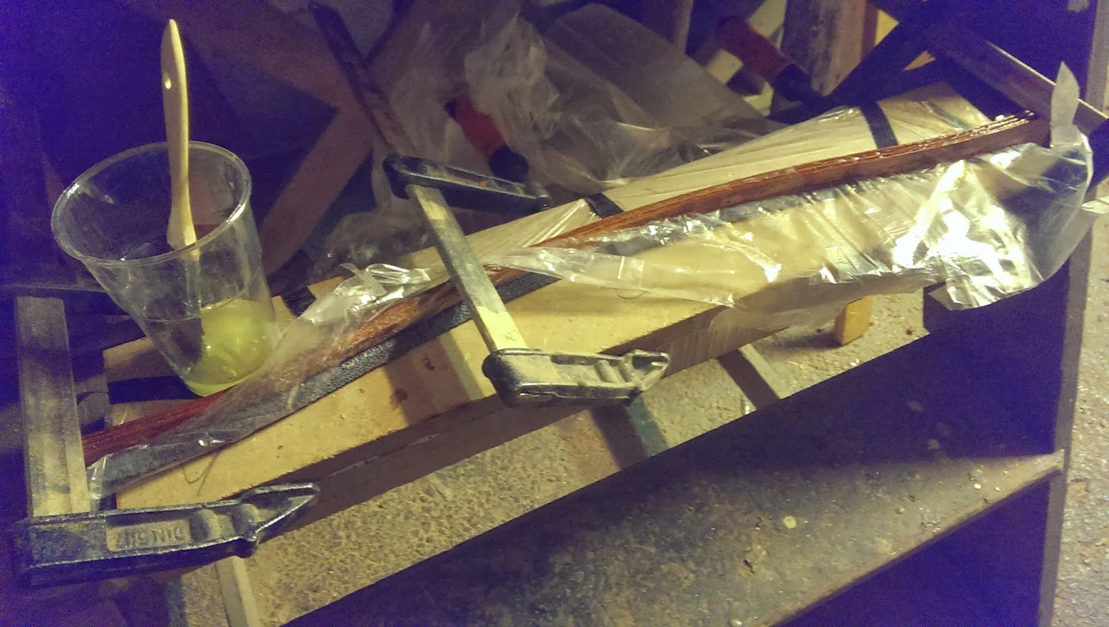 Bågarna för ryggstödet ville jag ha lite sväng på, så de skiktlimmar jag med epoxy av ett antal fanérbitar i press i en form.