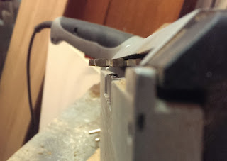 Använder en konisk sågklinga i sänksågen. Egentligen är det inte en sågklinga, utan en skivfräs, men jag köpte den med passande centrumhål för sänksågen, så de passar bra ihop. Sågar inte hela vägen igenom borden utan nöjer mig med 10 mm djupa spår.