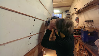 Nej egentligen är det inget problem med tjockleken i botten, det finns ganska mycket material där, men jag tänkte att det är lika bra att ta botten med nu när man ändå är igång, så blir det konsekvent nåtlimmat hela skrovet.
